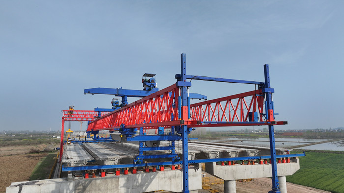 項目沿線處于長江沖洪積平原地區,地下水豐富、沿線魚塘密布,周邊建筑材料資源匱乏。為此,項目團隊通過采用膜袋吹砂快速成型工藝進行水網密布區域便道修筑、設置鉆渣改良基地等方式確保了施工進度。本次鋼混梁的成功吊裝,先后攻克“大構件、高精度、強協同”三大難關,為后續橋面鋪裝、附屬設施安裝奠定堅實基礎。